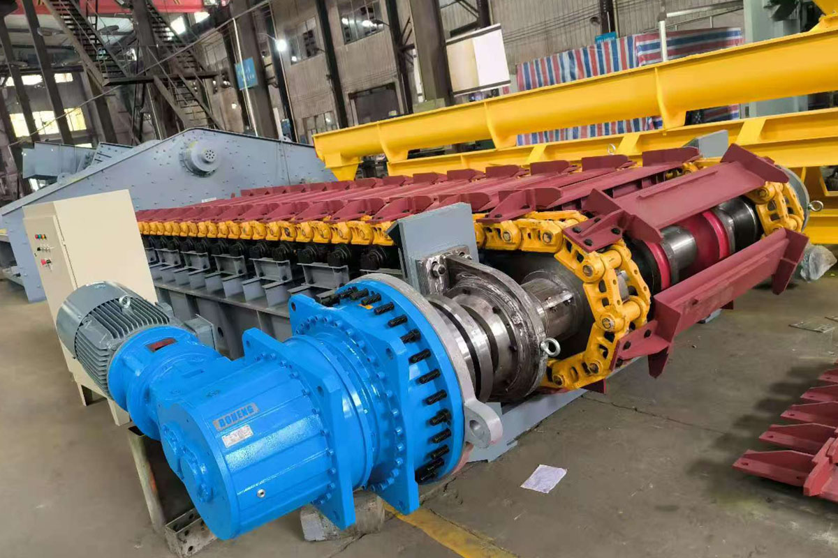 重型板式給料機整機及備品備件:頭輪裝置、尾輪裝置、鏈板(槽板)、鏈條、上拖鏈輥、承重輥、回程輥、鏈條等。重型板式給料機可水平安裝,也可傾斜安裝。為避免物料直接打擊到給料機上,要求料倉不出現卸空狀態。